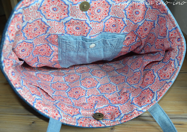 kieszenie: po jednej stronie trzy tzw. otwarte, po drugiej jeansowa, zapinana na guzik (wykorzystałam oryginalną kieszeń koszuli, z której szyłam tę torbę)