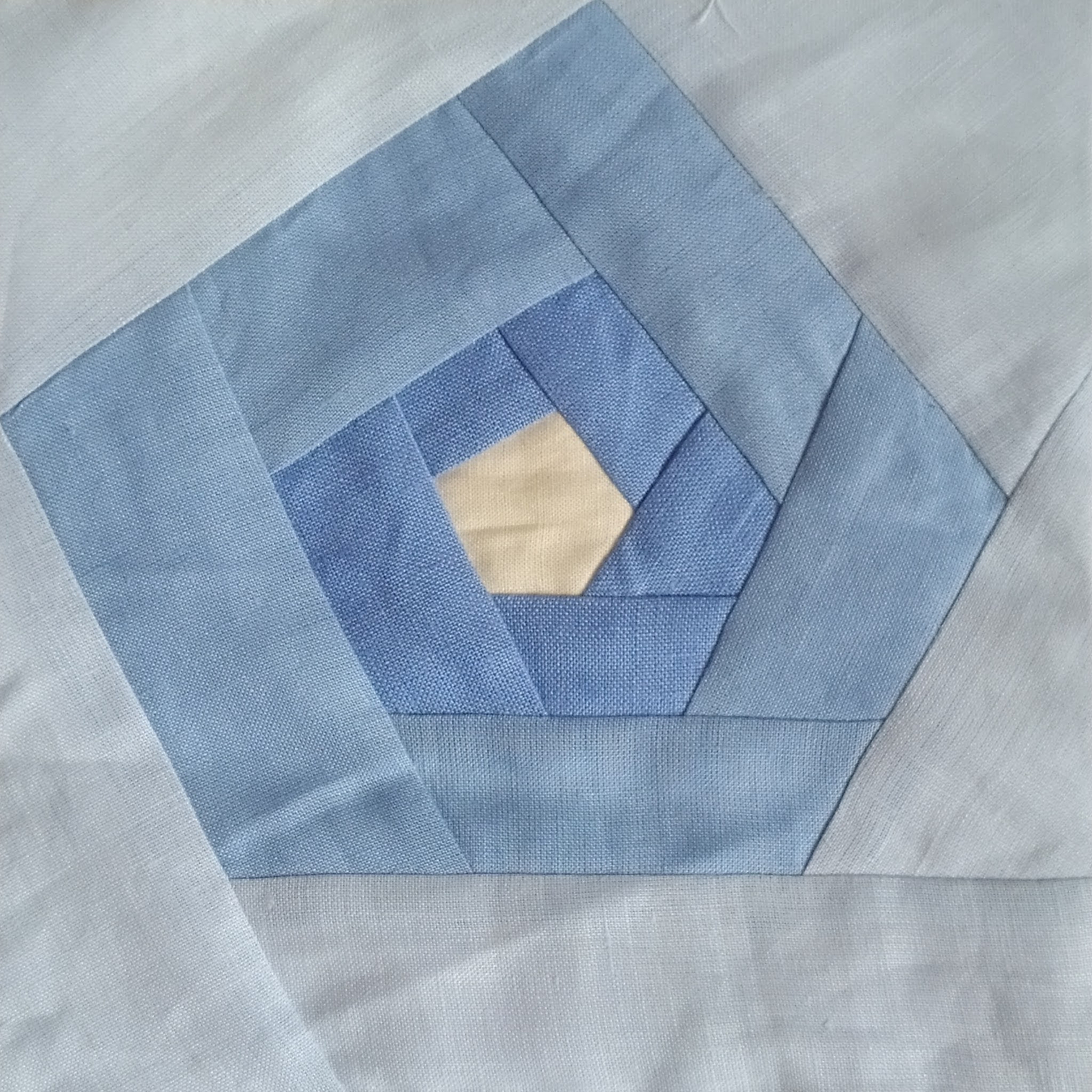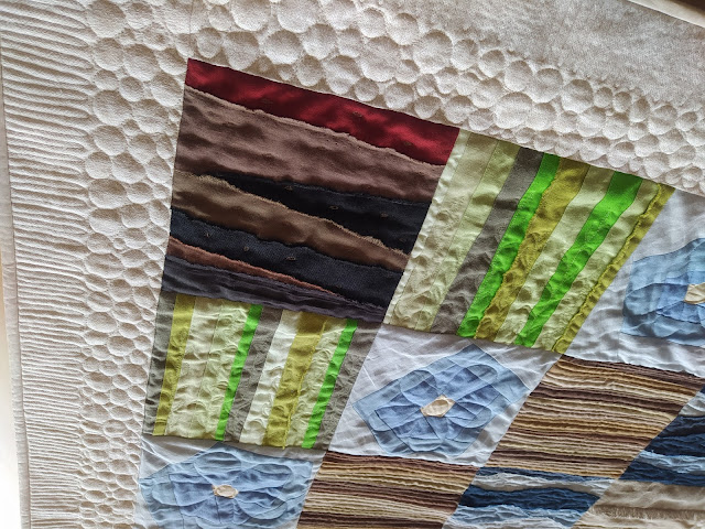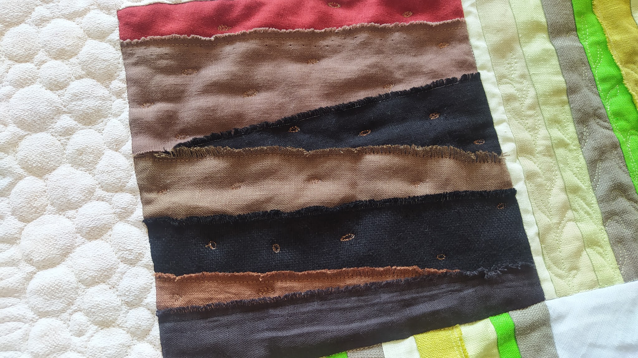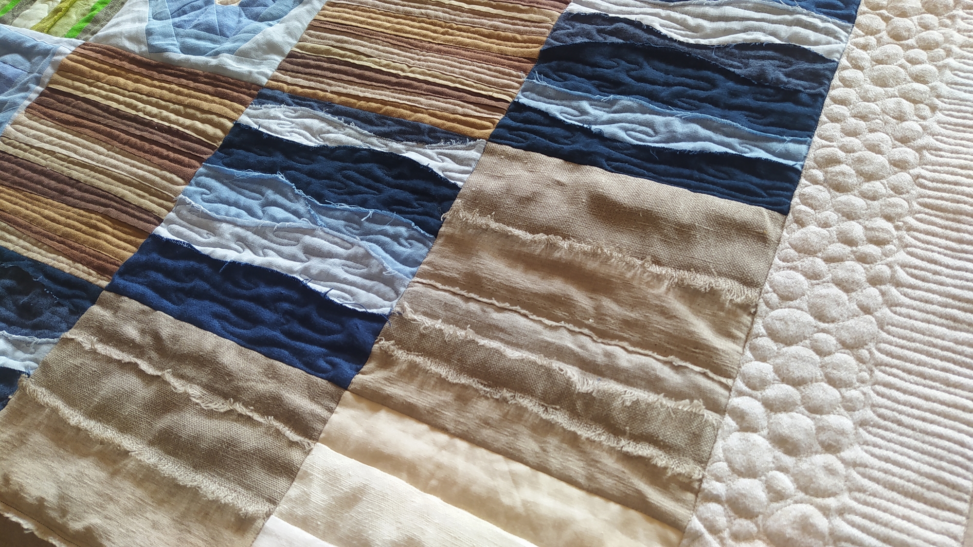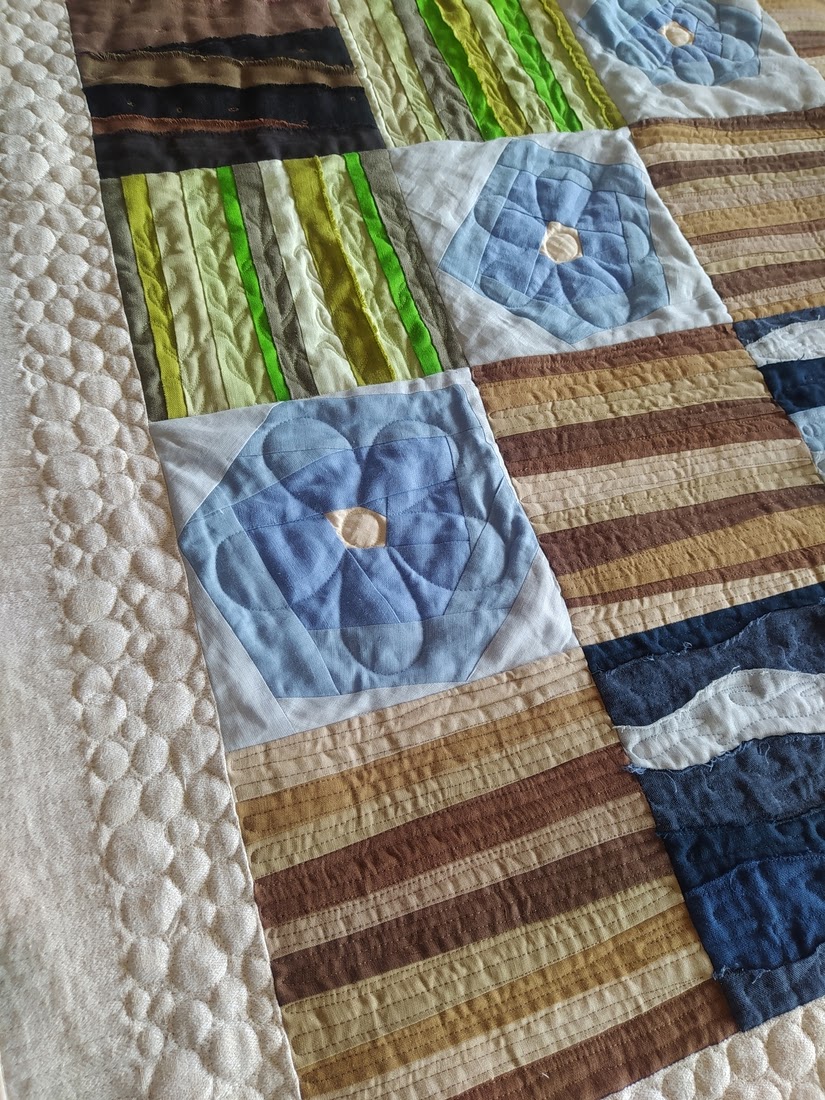 …połączyłam bloki w całość i obszyłam szeroką ramką – tu drugie życie dostał pewien lniany obrus tkany w delikatny wzór… potem wypikowałam bloki, starając się podkreślić pikowaniem poszczególne momenty powstawania lnianej tkaniny… są więc ziarenka, listki, kwiaty, łodygi leżące na polu, falująca woda, nici wątku 😉